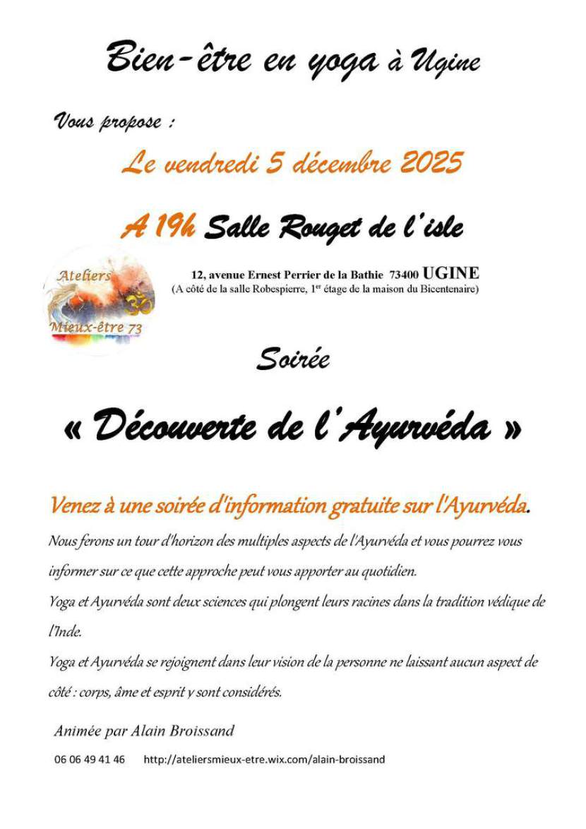- Jeudi 23/10/25 cours de Hatha yoga avec Sylvie, de 18h30 à 20h00, salle de danse du complexe sportif.